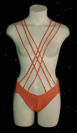 Description: No one wears as little as the Risans. No one needs to wear much more on a planet that has been weather, and pleasure controlled for centuries. With their open sexuality anything goes and usually does when this costume arrives. A pink-orange lower body swimsuit covering with matching cris-cross straps that extends over the shoulders and a gauzy, reflective see through sleeveless open front shirt made from synthetic material. The costumer's tag reads ‘Captain’s Holiday’ and indicates wear by various actors.