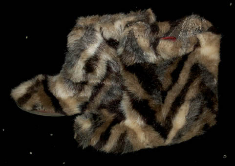 Description: A Ferengi costume featured in first season episodes of Star Trek: The Next Generation. The costume is a full length brown suede jumpsuit with synthetic reptile skin accents around the ankles, on the shoulders, and down the arms. Belt loops are apparent at the waist and the costume comes with an incredible striped fur sash that lies across the chest and back, diagonally with Velcro patches and matching spotted fur boots. The interior tag reads ‘J. Dengal', a tag inside the boots reads ‘Jake Dengel’, and an attached tag indicates use in ‘show 110’, presumably “The Battle”.