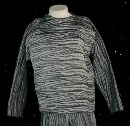 Description: A costume presumably worn by Eric Menyuk in his portrayal of “The Traveler” in the episode “Where No One Has Gone Before” of Star Trek: The Next Generation. When a strange alien comes on board the “Enterprise-D” to aid a Starfleet engineer in a warp field test only “Wesley Crusher” (Wil Weaton) notices The Traveler's strange abilities. As the test gets underway the ship is taken far beyond any expected distance to a place “Where none have gone before”. As Wesley and The Traveler become friends they form a bond that will last through many future episodes. His costume is made from a fabric that is horizontally placed on the chest, while being vertically inclined on the sleeves and pants. The fabric is silver, gray, and black wood patterned. The collar of the costume appears to have been cut out or unfinished and, indeed, the costumer’s tag reads ‘The Traveler, Eric Menyuk , Where None Have Gone Before, Top and Pants, Don’t know if used’.