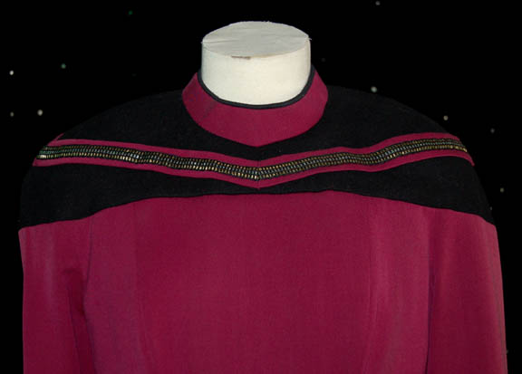 Description: A burgundy Starfleet uniform top from the episode “The Emissary” of Star Trek: The Next Generation. Worn by “Vice Admiral Gromek” (Georgann Johnson) when she ordered the “USS Enterprise-D” to pick up a special probe containing “K'Ehlar” (Suzie Plackson). The costume features the familiar black shoulders with division color sleeves and body but adds the accents of a gold and silver beaded trim around the shoulders and on the cuffs common among Starfleet ‘flag officers’ throughout the series. The costume also features a unique collar and fastens into pants (unavailable) through the use of a system of clasps. The uniform also comes with a pair of detachable shoulder pads and a costumer’s tag inscribed ‘#146 Emmesary, Georgann Johnson’.
