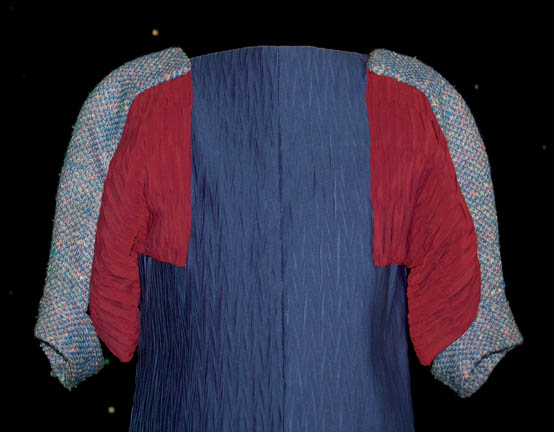 Description: When the Enterprise-D crew arrives at a planet that appears out of nowhere, every child aboard the ship is instantly transported to the surface. The reason for this becomes clear; the people on the planet hope to keep the children because their ability to reproduce has stopped! This costume is a blue and burgundy crimped fabric jumpsuit with knitted shoulders worn in the episode “When the Bough Breaks” of Star Trek: The Next Generation. The shoulders extend past where they join the jumpsuit to Velcro around the arms.