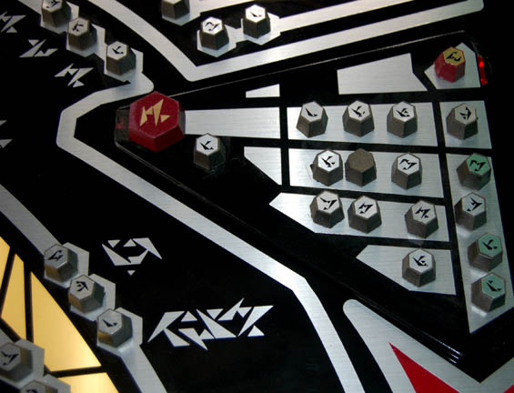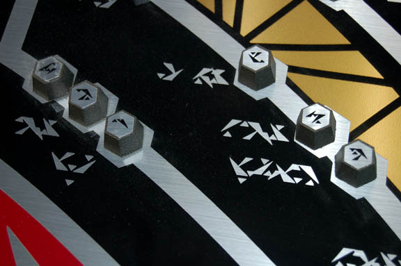Description: A large smoked acrylic computer interface panel with a translucent application and silver and metallic red application accents made to section out the panel into differing modules, and other metallic silver applications used as ‘Son'a’ character letters on both the panel and the adhered raised plastic buttons featured in Star Trek IX: Insurrection. A raised triangular surface is also present on the left side with similar features. Made to rest in a back lit console this item features a ‘lighted’ strip between two of the modules. Item measures approx. 23.25 X 15.5 X 1.25 inches. Penned in on the upper right hand corner of the front is an arrow pointing up and ‘#2’ with removable markings and on the reverse is a small sketch indicating the position of the item within a set console.