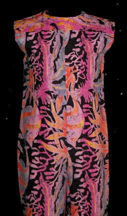 Description: This great little costume was worn by one of the civilian children who lived onboard the U.S.S. Enterprise under Captain Picard during Star Trek: The Next Generation. The sleeveless jumpsuit has an amoeba pattern design in various shades of purple, pink, orange and yellow on a black background. It also has a zip up the back.