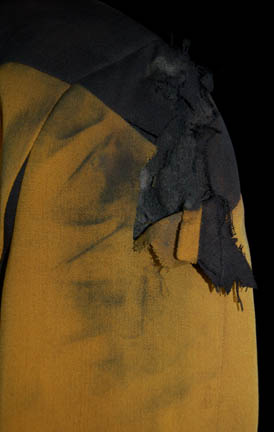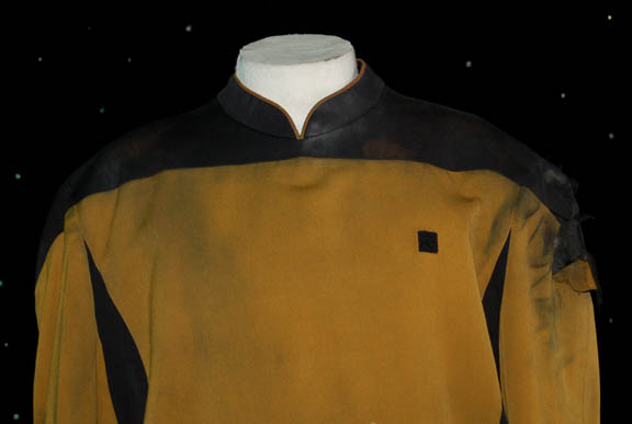 Description: The first and only Klingon in Starfleet, “Lt. Worf” led a life of duty to his ship, crew, and captain. When the time came for away team missions he was frequently selected due to his size, but also because of his sense of honor. He would never leave a crewmate behind unless ordered, and took a few hits in the process. That fact is visible in this distressed Starfleet uniform believed to have been worn by Michael Dorn during his portrayal of “Worf” in various episodes of Star Trek: The Next Generation. The costume is made up of a pair of black pants in an overalls fashion worn under an operations gold uniform jacket with a significant left shoulder wound and a degree of special effects grime present throughout to make the uniform appear aged. Costumer's tags are inscribed ‘Worf, Michael Dorn, gold/black S/F uniform coat, (distressed)’.