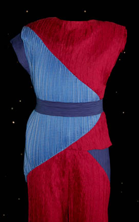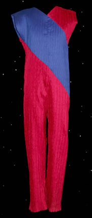 Description: This great little costume was worn by one of the civilian children who lived onboard the U.S.S. Enterprise under Captain Picard during Star Trek: The Next Generation. The sleeveless jumpsuit is made of crimped magenta and blue fabric that joins on a diagonal across the chest and has a zip up the back. The sleeveless crimped top worn over the jumpsuit is magenta and blue with white check also cut on the diagonal and zipped up the back. The costume also comes with a blue crimped belt that closes with Velcro.