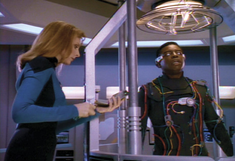 Description: (Paramount-TV, 1987-94) This small functioning prop measures 1 ½ in. long, and illuminates green with the flick of a tiny switch. The prop is made from resin with a brass effect etched display at the center. This prop was used in the season 7 episode entitled “Interface” where Geordi (LeVar Burton) rescues his mother.