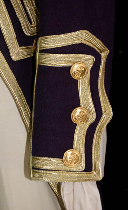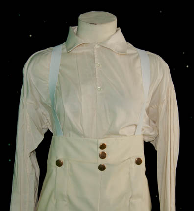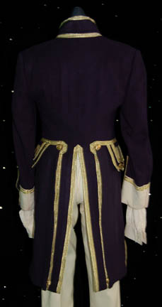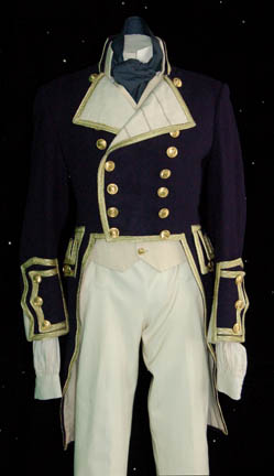 Description: This impressive navel costume was worn by “Dr. Crusher” (Gates McFadden) in Star Trek VII: Generations which was the first scene in a feature film involving the “Enterprise-D” crew. The crew were onboard a holographic sailing ship called ‘H.M.S. Enterprise' in celebration of the promotion of “Lieutenant Commander Worf” (Michael Dorn). The double-breasted uniform coat is navy blue with gold trim and gold buttons. It comes with a corresponding cream long-sleeve shirt and pants and a matching cream waistcoat. The accompanying high-heeled boots are black suede with gold trim and tassels at the top. All components feature sewn in Star Trek VII interior tags with ‘Gates McFadden’ type printed across them, and the costumer’s tag indicates ‘Gates #2’.