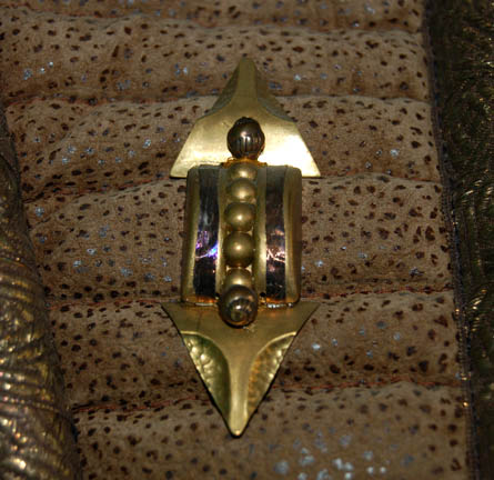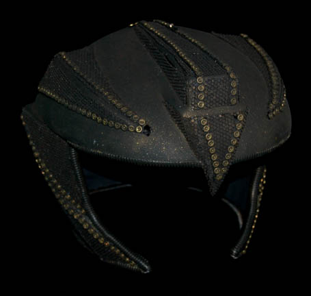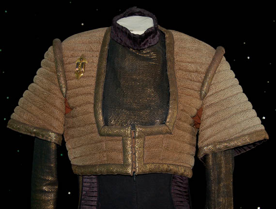 Description: Worn by Chad Allen during his portrayal of “Jono” in the episode “Suddenly Human” of Star Trek: The Next Generation. His family killed by Talarians, Jono, a human, was raised by the aliens who had been at odds with the Federation until being a young adult. When retrieved by the “Enterprise-D” it was soon realized that the only respect he held for any of the crew lay in “Captain Picard” (Patrick Stewart) whose discomfort around children was no secret. Eventually the two formed a bond despite some speed bumps along the way (Jono stabbed Picard through the chest) and a crisis between the Federation and the Talarians was averted. The uniform of the Talarians consists of a black jumpsuit with ribbed legs and a gold stripe down the outside seams, padded leather armor around the shoulders, chest, and back with gold trim and an open squared off neck revealing a gold ‘chain mail' type fabric also used in the sleeves. The armor also features a badge of rank on the right breast made of gold colored metal. The costume features a black plastic helmet with corresponding strips of fabric that match the sleeves. The costume also comes with a silver colored long sleeved shirt made with pleated stitching both horizontally and vertically. The costumer’s tag reads ‘Jono, Chad Allan’.