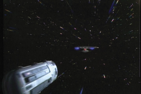 Description: (Paramount-TV, 1987-94) This model was featured during the second season in two different episodes: <em>“The Schizoid Man”</em> and <em>“The Emissary”</em>. In the first, it was used to represent a casket holding the body of the deceased Dr. Ira Graves (William Morgan Sheppard), Data’s “grandfather”. As Dr. Graves is sent into outer space, this model was used to show it flipping through the atmosphere. The model was then adapted for <em>“The Emissary”</em> and used to represent a probe beamed up and carrying K’Ehleyr from Starfleet Command who has been sent to warn the Enterprise of a ship carrying Klingons ready for battle. The model is made of grey plastic with a long handle for the special effects team to hold and move the pod. The model has had extra components added, such as panels and stickers to distinguish it from the earlier version. It also has a small window added to hide the photograph of the deceased Dr Graves.