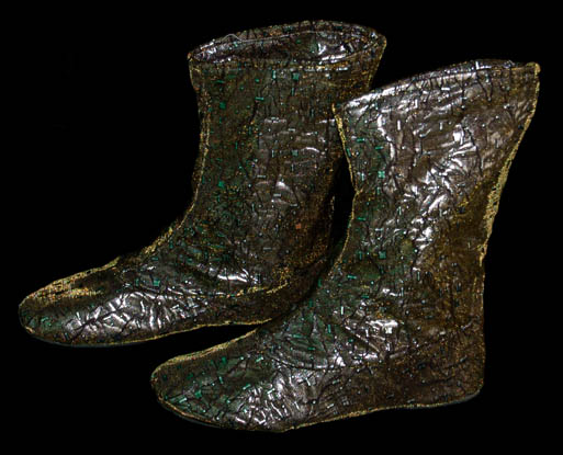 Description: A costume featured in the Star Trek: Enterprise episode “Unexpected”, yes, the one where “Trip” (Connor Trinneer) gets pregnant. This costume is made of a shiny silver material with a ‘dried Earth' pattern underneath a see-through gold mesh material with inset reflective shapes, conjoined by a series of vein-like tubes running up and down the extremities of this full length body suit. Even the matching shoes are made from the same materials. The costumer’s tag reads ‘David Walrod’.