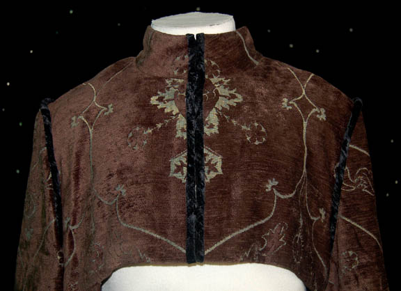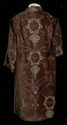 Description: Featured in the Star Trek: Deep Space Nine episode “Inter Arma Enim Silent Leges” during scenes involving the ‘Romulan' Continuing Committee, this cropped over coat is made to be worn on the shoulders and arms. It features a purple patterned fabric with a black nylon interior and snaps and clasps in the front. The ‘MTO Little, Los Angeles’ tag sewn in indicates use in Star Trek: Deep Space Nine as does the costumer’s tag.