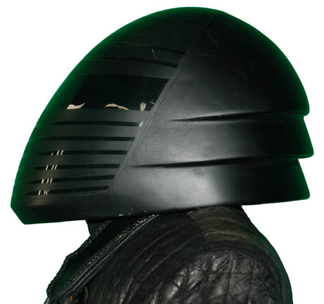 Description: A militaristic costume worn in the episode “Resistance” of Star Trek: Voyager. When “Captain Janeway” (Kate Mulgrew) is separated from her away team on a planet ruled by a tyrannical government she attempts to evade the security forces of the ruling faction until she can retrieve her captured crewmates. The ‘Mokra' government wore costumes like these; an impressive suede uniform jacket with quilted black leather shoulders and sleeves that zips up the front, with black spandex pants, and incredible leather boots with straps. The costume also features a harness that loops around one shoulder and around the ribs, latching in the back and a black plastic helmet with a clear facemask. The costumer’s tag reads ‘Resistance’ and a sewn in tag in the jacket indicates use in episodes of Star Trek: Enterprise.