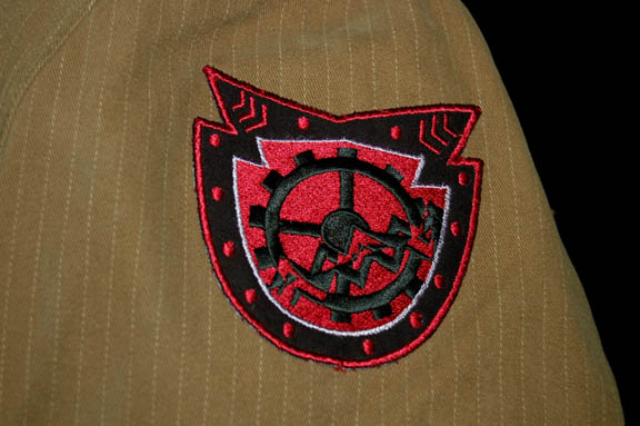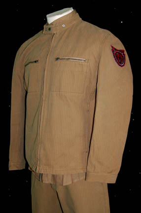 Description: A very practical costume put together for the Star Trek: Enterprise episode “The Communicator”. Having accidentally left behind a piece of Starfleet technology while studying a pre-warp alien society, the crew of “Enterprise NX-01” has to send a second away team back down to the planet in an effort to retrieve the device. Captured almost instantly, the away team is interrogated by the alien military who wears costumes like these; a pair of khaki pants with very fine white pinstripes, a short sleeve button front collared shirt of tan color, and a uniform jacket that matches the pants by way of material, zips up the front, with a pair of zip seal pockets and a snap collar. Most significant about the jacket is the twin sewn in patches on either shoulder depicting a black cog on a red background. Sewn in Enterprise tags indicate wear in the episode and original manufacturers tags are still present indicating make by ‘Armani Exchange'. The zipper pulls have been purposefully removed.
