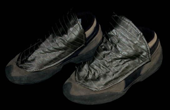 Description: A full length gray jumpsuit with command red division stripe around the shoulders and chest featured in the Star Trek: Voyager episode “Blood Fever”. When ‘Vulcan' engineering crewman “Vorik” (Alexander Enberg) begins to experience the dangerous effects of ‘Pon Farr’, he beams himself and his intended partner, “B’Elanna Torres” (Roxann Dawson) to a planet where “Tom Paris” (Robert Duncan McNeil) may be the only person who can save her. This stunt costume was made to portray Tom Paris in the episode. Worn by stunt person Jimmy Heart, this costume is made to be form fitting and features reflective silver accents, a black leather belt with sewn in loops for ‘away team’ gear and a matching keep to cover the Velcro seal. The costume also comes with corresponding ‘Nike Air’ tennis shoes with added Velcro patches for reflective silver spats which cover the laces and the costume comes with detachable shoulder pads.