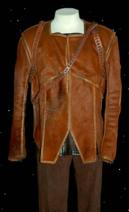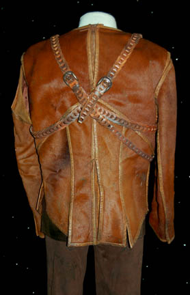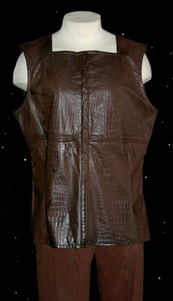 Description: This elaborate costume is made up of impressive components! A pair of brown suede-like pants, a brown synthetic reptile skin vest, and a brown overcoat made from synthetic fur with leather trim and accents, and a braided leather harness that wraps under the arms and crosses the back in an ‘X' fashion, synching up to fit by a buckle system. This being a stunt costume it has experienced a degree of damage in that the zipper on the pants is broken, the left sleeve of the overcoat has torn partially off the costume, and the interior Velcro clasp on the chest has almost come off. Made to be a ‘Nausicaan’ costume for the episode “Fortunate Son” of Star Trek: Enterprise, three costumer’s tags indicate wear by ‘Scott Workman’.
