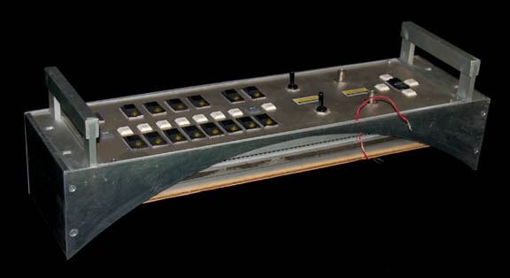 Description: Featured in various episodes of Star Trek: Enterprise in the engineering department, this item was inset into any one of a large series of like control junctions that made up parts of the walls of engineering. This button board features fifteen ‘action buttons' that actually depress to presumably switch on or off a light, and a series of individually and apparently randomly numbered faux buttons the likes of which were seen all over the “Enterprise NX-01”. An additional pair of switches and a pair of what might be coaxial inputs are present on the metallic silver surface along with affixed handles and two numeric applications. With a pair of untested wires extending from the reverse side, the item has penned in markings indicating ‘12volt DC in here only’. Made to be wall or rack mounted, the item features a curved mounting bracket that surrounds the item for fitting into the curved bays into which it was painstakingly removed before set strike. This charming piece of the first warp five engineering department set measures approx. 19.5 X 5.75 X 5.5 inches.