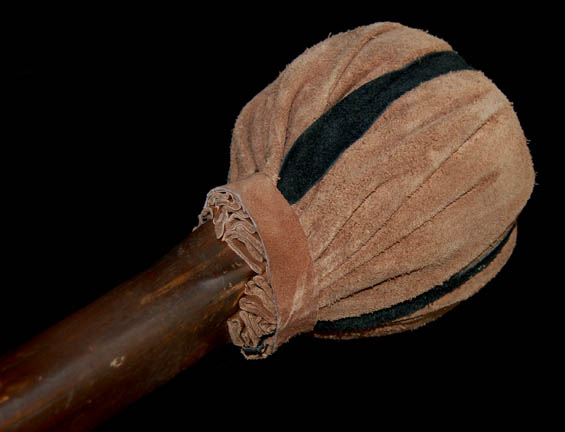 Description: An approximate 37.5 inch stained wood instrument with a slight curve and a leather padded end. The grip features a black leather wrap around it that is bolted into the wood. This may be either a large drum stick for striking a gong or it could be a stunt weapon.
