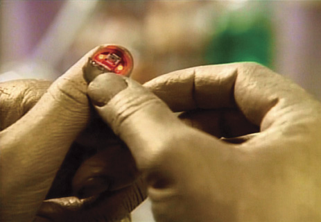 Description: (Paramount-TV, 1987-94) From the fourth season episode <em>“Brothers”</em>;<em> </em>when Dr. Soong accidently implants a chip in to the wrong brother, Lore (Brent Spiner) opens his right thumbnail, presses the button in the middle and the small LED lights begin to glow which activates the transporter in his ship, beaming him away. The thumb is made of an inner layer of fiberglass with a rubber “skin” layer which has line details and has been painted with the golden sheen shared by the brothers. The thumbnail can be lifted up, and the inner light is powered by a 9-volt battery which can be hidden in the palm when the thumb is worn. A great special-effects piece from the series.