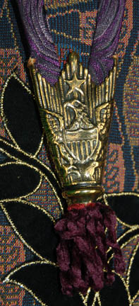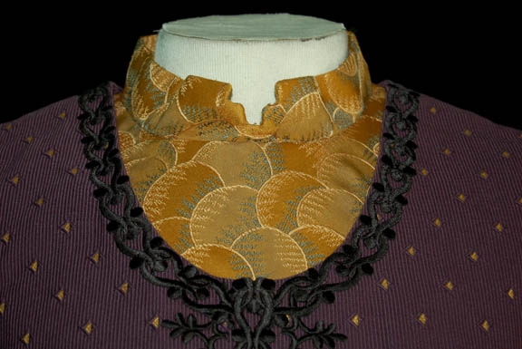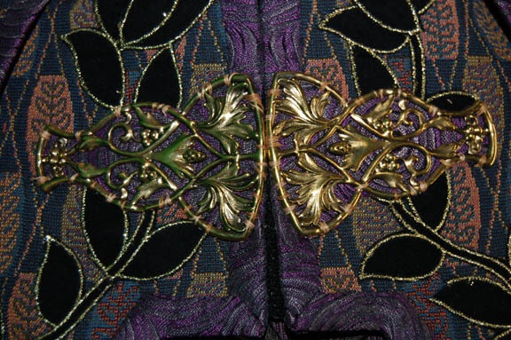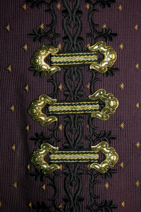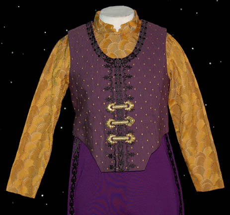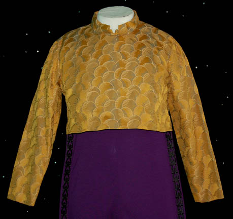 Description: “Zek” (Wallace Shawn) was the famed Ferengi Grand Nagus featured throughout the Star Trek: Deep Space Nine series. As the leader of the Ferengi Alliance, he was both the political and economic leader of his people. His elaborate costume includes a tri-tailed crop waist coat made with multiple fabrics primarily purple in color. The chest has a black leaf motif with gold trim that is also seen up the back and down the two outer coat tails. The tips of the collar have gold colored metal fixtures with an eagle, shield and star design. The chest also has elaborate gold colored metal decorations. The sleeveless jumpsuit is purple with black embroidered designs down each leg. Worn over it is a long sleeve gold patterned top that zips at the back. The next layer is a purple waistcoat with small yellow triangles and three gold colored faux clasps at the front. The waistcoat actually zips up the back. The costume is complete with purple shoes. The costume comes complete with costume tag that reads “DS9, Zek – Wallace Shawn” however the sewn-in tag in the coat reads “Voyager, Wallace Shawn”. “Zek” never appeared in a Star Trek: Voyager episode so the reason why a ‘Voyager' tag was used to mark Shawn’s name is unknown. Also included in this lot is “Zek’s” stunt double costume that includes the same coat and waistcoat as the hero version however the gold decorative attachments have not been added. The gold patterned top is the same. The stunt jumpsuit and shoes are not available. This costume comes complete with its own costume tag.
