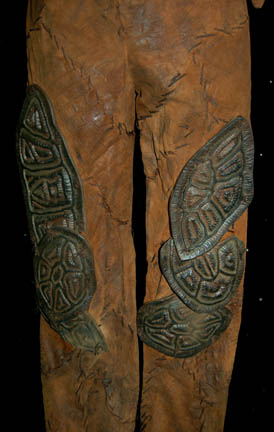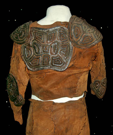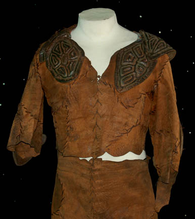 Description: A colony that disappeared creating a mystery for all of humanity is left for the crew of "Enterprise NX-01" to solve. The ‘Novans' are a colony of humans living on the planet Terra Nova who were investigated by Captain Archer (Scott Bakula) and his away team during the Star Trek: Enterprise episode “Terra Nova”. Both the pants and cropped top are made of brown roughly cut leather pieces that have been hand stitched together. Attached to the legs, arms and shoulders are pieces of sculpted latex that have been painted brown to resemble thick leather. The accompanying shoes are made of Neoprene covered in brown hand stitched leather with faux leather latex pieces attached on top. Costume comes complete with costume tag.