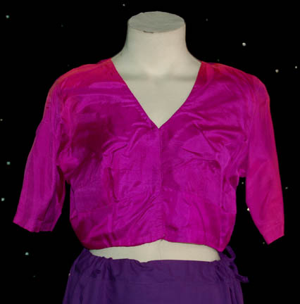 Description: Featured in the episode “The 37's” of Star Trek: Voyager, this practical Indian saris is comprised of a purple skirt, pink top, and a wild flower patterned saris worn by Rita Dail as evidenced by the sewn in Voyager tag.