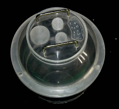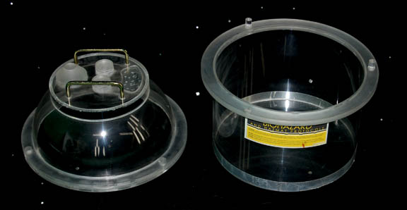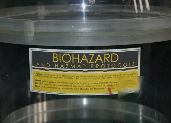 Description: A clear plastic cylindrical container with a dome lid that features a Starfleet inventory application detailing the item as ‘Biohazard and Hazmat Protocols'. The lid features a set of resin accents and a pair of metal handles while the cylinder base is accented by a strip of metallic silver tape. The item measures approx. 15 X 14 inches diameter.
