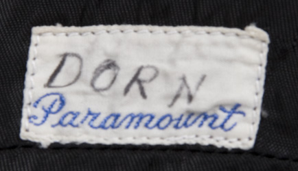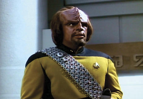 Description: (Paramount-TV, 1987-94) This trademark uniform is mustard yellow and black with yellow trim around the neck; it has been “broken down” by the costume department and appears to have been burnt with small holes on the arms and across the top of the chest. The plastic silver and gold communicator badge is fixed with a piece of Velcro to the chest. Worf wears this style of uniform in the third season episode <em>“The Bonding”</em>, when he is caught in an explosion during an expedition to a barren planet once home to the Koinonians.