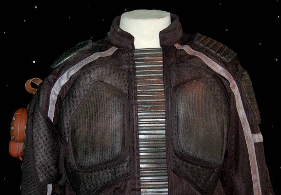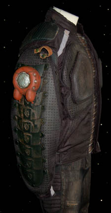 Description: Having entered the treacherous Delphic Expanse to locate the mysterious Xindi, the crew of “Enterprise NX-01” comes under attack by pirates from outside the Expanse! ‘Osaarians', board the ship and place numerous transporter tags onto various items within the cargo holds of “Enterprise”, stealing them, but not before the crew and MACOs engage them in a firefight. Their costumes are a patchwork of practical motorcycle jackets and pants with attached plastic ‘armor’, multiple belts and straps and buckles, and painted on distress. The right sleeve of the jacket features a Velcro patch for an affixed brown painted cast resin ‘transporter control’ with tested lights, one which shines red, and another set around the item that flash orange in sequence, all powered by a single 9volt battery that still holds a charge, activated by buttons on the exterior. The costume also comes complete with an elaborate pair of boots which feature leather straps and buckles. Sewn in Enterprise tags read ‘Tom Morga’.