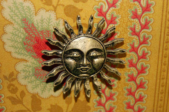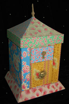 Description: A large multi patterned fabric covered jewelry box with a pair of deep drawers on the front and a pyramidal lid that comes away to reveal a sectional placement for knick knacks. Measures approx. 11.25 X 13 X 21 inches.