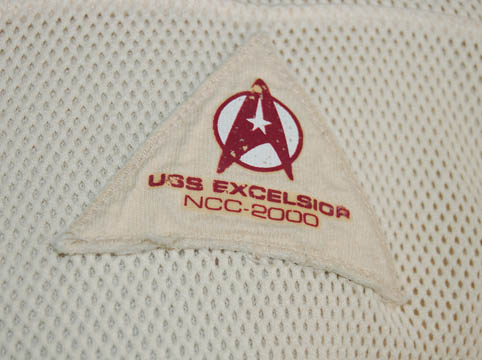 Description: A cream colored mesh short sleeved shirt with a triangle shaped patch featuring a Starfleet logo and ‘U.S.S. Excelsior NCC-2000” written underneath in red, with corresponding cream colored shorts with an elastic waist made as sleep wear for Star Trek VI: The Undiscovered Country. An interior tag within the shorts reads ‘Maria Doest'. The shorts feature a ‘Gold’s Gym’ logo tag and the shirt features a ‘Diner’ tag with washing instructions.