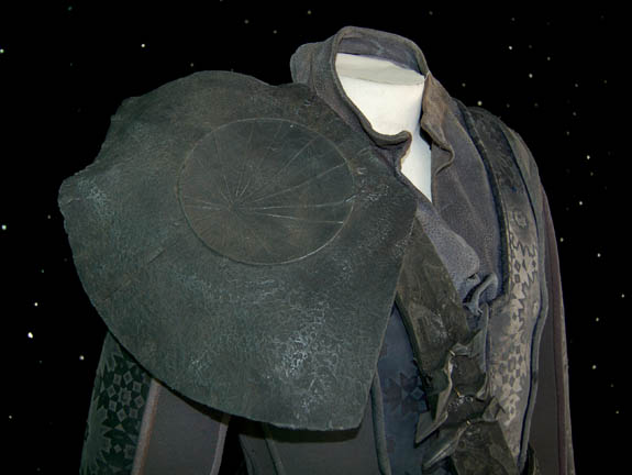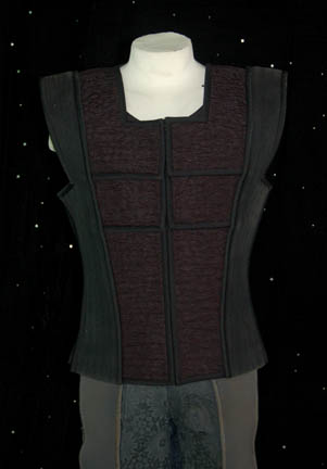 Description: The ‘Jem' Hadar’ are a military super power from the Gamma Quadrant who were genetically engineered by the ‘Founders’ to make them several times more powerful than humans. This ‘Jem’ Hadar’ uniform consists of a neoprene gray sleeveless jumpsuit with geometric patterning down the front and back and a zip at the front. The jacket is made of the same material with a matching design and leather attachments to the collar area. A black rubber harness that does up with Velcro is worn around the waist and over the shoulder. To accompany the uniform is a black vest with puckered fabric and black solid trim as well as a gun holster. The costume comes complete with matching boots and costume tags.