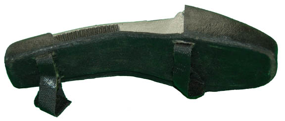 Description: Cast in foam rubber and latex, painted metallic silver, this phaser is fused immediately into its black holster so as not to be drawn. Made for background actors to be ‘armed' but not to engage the enemy in battle. This item features Velcro straps for attachment to uniforms. This particular item features rectangular buttons painted gold and red metallic colors. Measures approx. 8 X 2 X 1 1/2 inches.