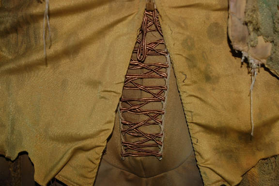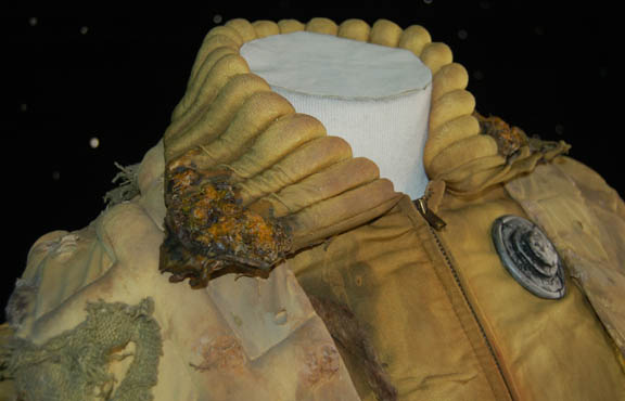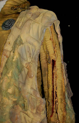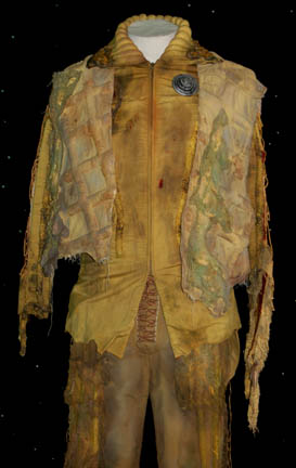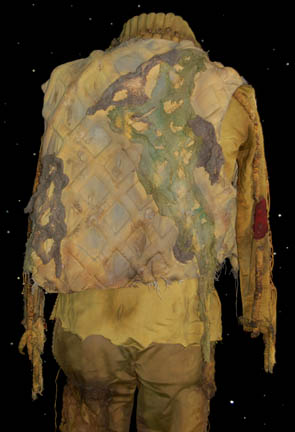 Description: A costume featured in Star Trek II: The Wrath of Khan, worn by one of “Khan's” (Ricardo Montalban) men while on the bridge of “Starship Reliant” during their principle attack on the “Enterprise”. Made of multiple different components, the costume features a jacket with a zip up the front with a ribbed collar and a sewn in metallic silver badge that is made from cast resin and aged to appear worn. The sleeves feature thrashed and torn lace on the outer seams and sewn on tatters. A vest with a square patterned ‘upholstery’ fabric and woven patches on the back is included. The pants match, made of spandex with the same kind of details but with dried special effects stains to make them appear distressed. The corresponding costumer’s tag reads ‘Star Trek II, Scott Wells, (Khan’s Man)’.