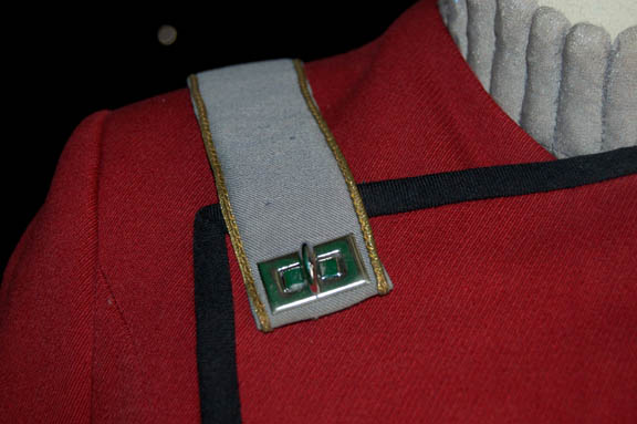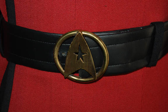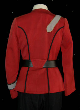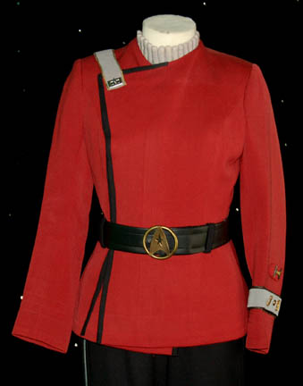 Description: A Starfleet officer's uniform featured in opening scenes of Star Trek VII: Generations, worn by veteran sci-fi actress Jeanette Goldstein while playing the science officer aboard the newly built “U.S.S. Enterprise-B”. Jeanette Goldstein played “Private Vasquez” in “Aliens”, and the foster mother of “John Connor” in “Terminator 2: Judgment Day”. Her costume in “Generations” is a pair of black trousers with a gray stripe running up the outer seams and Velcro adjustments at the ankles, a ribbed collar gray sleeveless undershirt, a red Starfleet uniform jacket with tan interior breast , silver chain accents on the outer layer and part way down the inside snap seam, and black nylon lining, black piping, belt loops at the waist front, an attached rank placement on the left sleeve with an appropriate, affixed, metal pin indicating the rank of ‘lieutenant’, and a corresponding sewn on gray division strip around the sleeve with a pair of attached gold colored commendation bars bracketing a round gold colored service pin featuring a Starfleet arrowhead logo. The costume also features a corresponding gray shoulder division strip that is unattached to the back, but clasps to the front and a black leather belt with a metal Starfleet belt buckle. The pants, jacket, shirt, and belt all feature identifying markings either as a Star Trek VII tag inscribed ‘Jeanette’ or a label marked similarly. Additional gray ribbed cuffs have been included for a more complete costume.