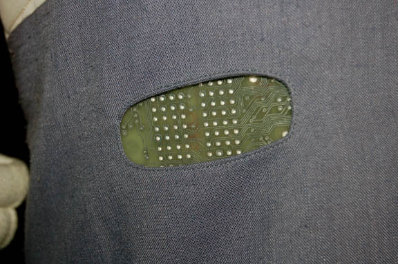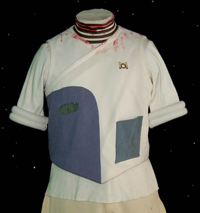 Description: A costume featured in Star Trek II: The Wrath of Khan, worn by a researcher from the “Regula I” space station where scientists were developing ‘Project Genesis'. The costume is cream colored trousers with Velcro at the ankles and a brown waist for wear with a matching fabric top that tucks into the pants, separated by a seam to a cottony upper portion. The sort sleeves are ringed and the collar is ringed with brown and white stripes. A vest is worn over the shirt made to appear double breasted with a purple area on the lower right that includes an opening where a circuit board is sewn in, on the lower right and a purple pocket in the front, the left breast features a sewn in plastic accent. The vest zips up the back. The costume comes with a costumer’s tag indicating wear in ‘Star Trek II’ and ‘Anthony as Steward’. The distress is evident In that special effects blood is apparent on the costume around the neck of the vest and shirt and minor spots are visible on the pants due to “Khan’s” (Ricardo Montalban) take over of the space station.