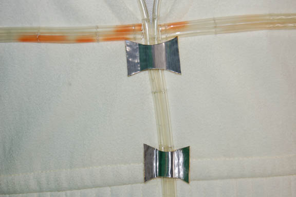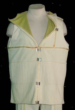 Description: An extremely soft cream colored sleeveless tunic and matching pants featured in Star Trek I: The Motion Picture. This tunic features a green interior hood, Velcro placements for plastic tubing that are affixed by silver colored attachments placed intermittently, ribbing around the ribs, and matching pants with the same tubing and attachments. The ankles are size adjusting with Velcro. Costumes like this made appearances on “Spock” (Leonard Nimoy) after his space walk and mindmeld with the ‘V'Ger Probe’.