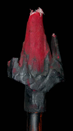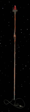 Description: As “Captain Kirk” (William Shatner) and “Dr. McCoy” (DeForrest Kelly) were put on trial for the assassination of “Chancellor Gorkon” (David Warner), they are placed in the witness stand under the imposing scene of hundreds of Klingon attendees slamming staffs against the floor of their balconies repeatedly yelling, “Kirk! Kirk! Kirk!” This item is a metal staff with attached prop blade, wired to allow for the translucent red ‘lava rock' end to light up, as seen in the show trial scenes of Star Trek VI: The Undiscovered Country. The untested light is powered through a wire that runs out the foot of the staff. The ‘blade’ is plastic and painted to appear aged; the ‘lava’ tip is translucent red plastic with a painted base to appear mounted on stone. Due to time and storage conditions the tip is damaged at its end and may have been repaired previously as a crack line is evident but the piece is solid despite. Item measures approx. 79 X 6 inches at the blade and 79 X 5 inches at the top.