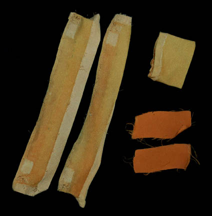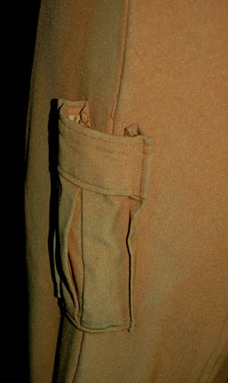 Description: A tan, men's uniform jumpsuit with a sewn on open topped pocket on the right thigh with a Velcro and clasp system at the ankles for size adjustment. The left cuff has been partially removed while the right one is included but separate. The costume comes with a bag of fabric scraps matching the uniform and the fabric of the item itself shows signs of fading due to light.