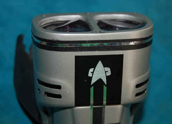 Description: Featured in 24th century era Star Trek episodic television and feature films, this cast resin wrist torch is an excellent example of the quality that goes into Star Trek hand props. A metallic silver painted battery housing with untested twin affixed ‘Surefire VER' lamps powered by six DL123A sized 3volt batteries which are activated by a depressed switch on the hind of the item slides into another resin casing with affixed lenses and light dampening slides showing signs of use. The slide features an adhered rubber strap with a Velcro size adjusting strap and further black rubber accents. The top of the slide is emblazoned with a Star Trek: Generations style Starfleet logo surrounded by painted black accents and metallic silver adhesive details. Measures approx. 5.5 X 3 X 3 inches.