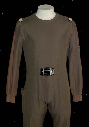 Description: A dark gray uniform jumpsuit featured in Star Trek I: The Motion Picture with an attached plastic bio-monitor with painted black and silver accents and a size adjusting Velcro and clasp system at the ankles. The uniform features an open topped pocket on the right thigh, white command division strips sewn onto the shoulders and a costumer's tag indicating ‘Starbase Personnel”.