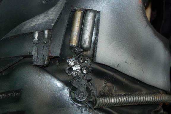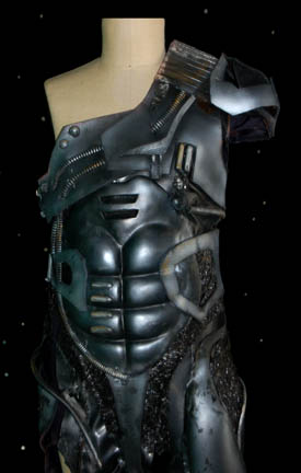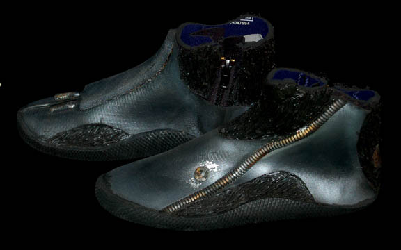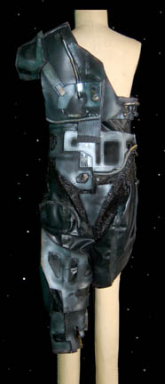 Description: A child sized Borg costume made for the Star Trek: Voyager episode “Collective”. When crew members from “Voyager” encounter a Borg Cube ship, they discover a group of Borg children who are malfunctioning due to an infection by ‘Species 8472', the alien race most dangerous to the Borg. The children are taken back to the ship and eventually begin to integrate with the crew. This costume was worn by Kurt Wetherill during his portrayal of “Azan”, who joined the crew with his twin brother and was eventually returned to his home world in the episode “Imperfection”. This Borg costume is made of neoprene and molded rubber components. It comes with a pair of neoprene shoes with zipper and Velcro enclosures, and jumpsuit with chest plate top. Due to storage or transport conditions the costume shows some significant signs of damage. The interior Voyager tags read ‘Kurt’ and the costumer’s tag reads ‘Kurt Wetherill’.