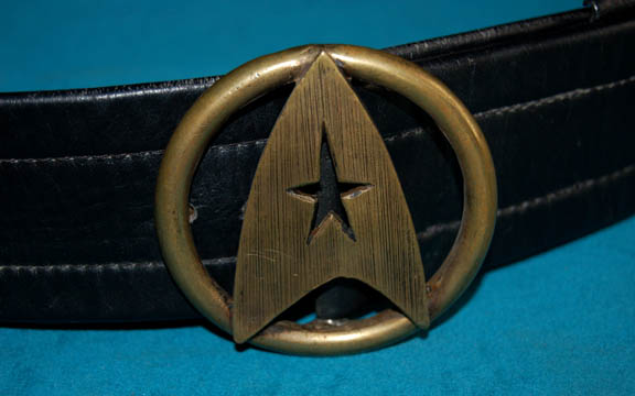 Description: A gold colored Starfleet emblem belt buckle on a black leather costume belt with label indicating it to measure ‘32-34' inches featured in various Star Trek movies from Wrath of Khan through Generations and making appearances in various episodes of Star Trek: The Next Generation and “Flashback” of Voyager. This style was used on officer’s uniforms and as a display piece, for collectors purposes, or to outfit an existing uniform bereft of such an article this item is a highly sought after accoutrement.