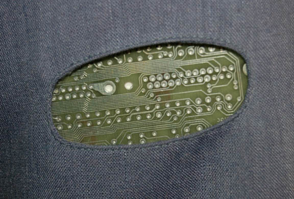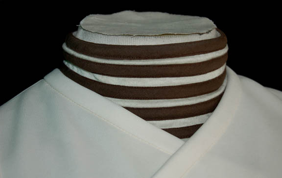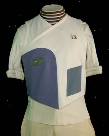 Description: A costume featured in Star Trek II: The Wrath of Khan, worn by a researcher from the “Regula I” space station where scientists were developing ‘Project Genesis'. The costume is cream colored trousers with Velcro at the ankles and a brown waist for wear with a matching fabric top that tucks into the pants, separated by a seam to a cottony upper portion. The sort sleeves are ringed and the collar is ringed with brown and white stripes. A vest is worn over the shirt made to appear double breasted with a purple area on the lower right that includes an opening where a circuit board is sewn in, and a purple pocket in the front, the left breast features a sewn in plastic accent. The vest zips up the back. The costume comes with a costumer’s tag indicating wear in ‘Star Trek II’ and the name ‘Stewart’. It is not known if this is a character or an actor but a tag on a corresponding costume reads ‘Anthony as Steward’.