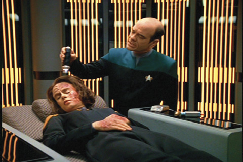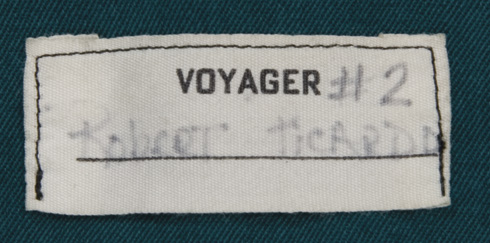 Description: (Paramount-TV, 1994-2001) Black and green Starfleet duty jumpsuit uniform worn by the holographic Doctor played by Robert Picardo on <em>Star Trek: Voyager</em>. The costume also includes an original Velcro-attached Comm badge. Internal Voyager label marked “Robert Picardo #2.”