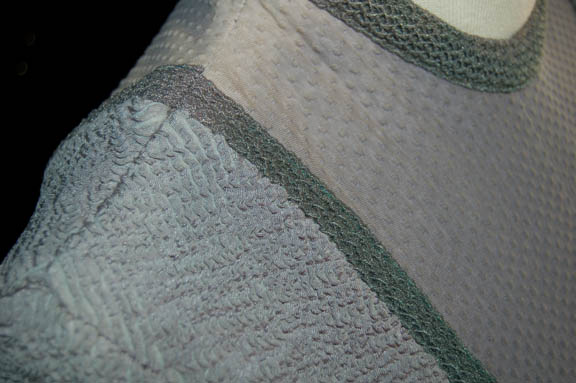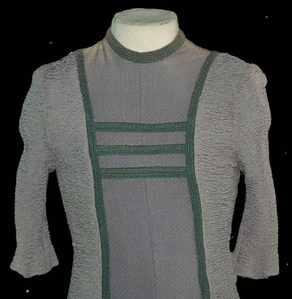 Description: This great jumpsuit was worn by “Captain Picard” (Patrick Stewart) in the Star Trek: The Next Generation episode “Suddenly Human” where he discovers a human boy being raised by aliens who murdered his parents. Picard's racquetball suit is gray fabric that has small patterned bumps in the front and puckered fabric down the sides and sleeves. Green trim decorates the collar, chest and down each leg. There is some fading to the shoulders caused over time and storage conditions. Costume comes complete with costume tag. Also included is a futuristic racquetball racquet from the same episode.