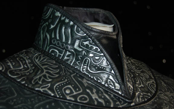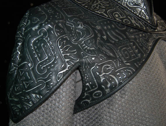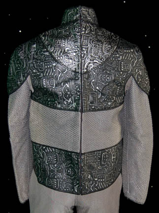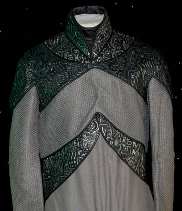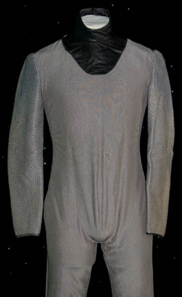Description: Featured in the Star Trek: The Next Generation episode “Transfigurations” this full length gray spandex jumpsuit comes with gray fabric and black Vinyl torso armor that features raised ‘alien hieroglyphics' with painted silver accents. The sewn in tag indicates wear by ‘Brian Tomlinson’.