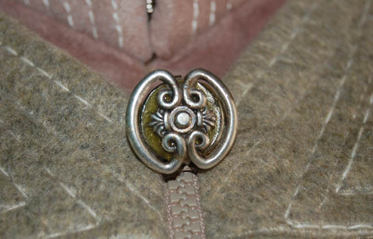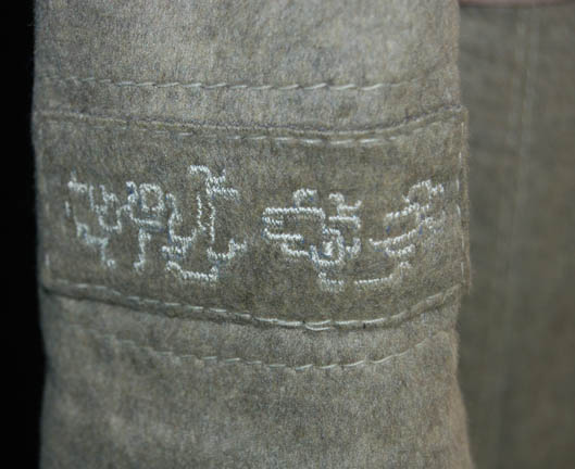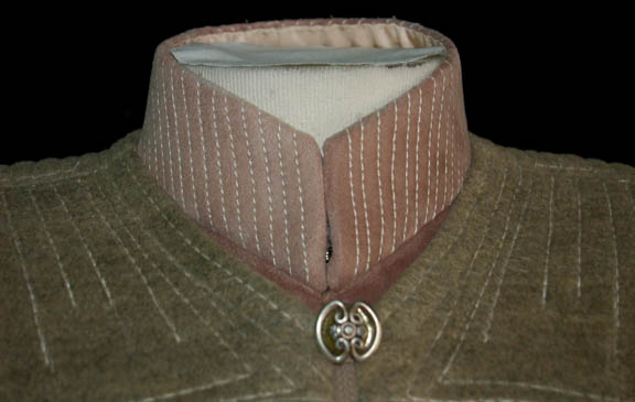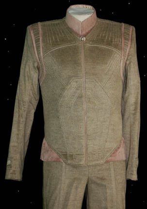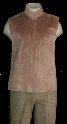 Description: A beautiful three piece uniform made from an elaborately sewn ultra soft fabric composed of a suede sleeveless undershirt, a pair of pants and a matching jacket that zips up the front, all featured in the Star Trek: Enterprise episode “Cogenitor” as a ‘Vissian' costume. The cuffs of the sleeves have sewn on ‘Vissian’ script embroidered to an attached patch and the front zip is made to be covered by a small silver colored metal clasp that is pinned to the zip itself. An included costumer’s tag reads ‘Joshua Brown’.