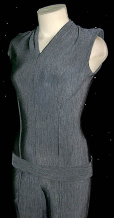 Description: This sleeveless jumpsuit was worn by T'Pol’s (Jolene Blalock) stunt double in the Star Trek: Enterprise episode “A Night in Sickbay”. Made of gray stretch Lycra, the jumpsuit has a V-neck and single rib trim down the front and back. It zips up the back and comes complete with a matching belt.