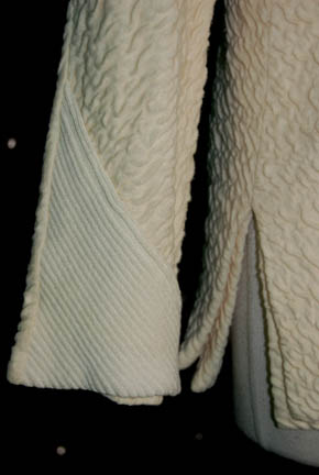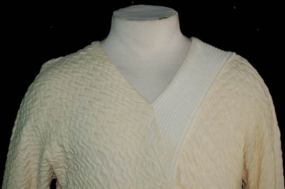 Description: This great Tai Chi top was worn by “Geordi La Forge” (LeVar Burton) in the Star Trek: The Next Generation episode “Clues”. The top is cream puckered fabric with white accents on the cuffs and collar. There is slight discoloration to a section of the white collar. The inside tag reads “Star Trek TNG, LeVar Burton”. The costume comes complete with costume tag.