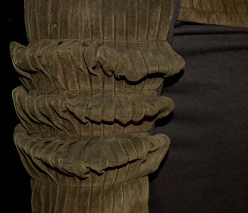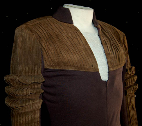 Description: The “Cairn” are a telepathic species who communicate solely by telepathy. They were featured in the Star Trek: the Next Generation episode “Dark Page” where Lwaxana Troi (Majel Barrett) was assigned to help them integrate and communicate more effectively with the Federation. This is a Cairn costume from that episode and is a brown jumpsuit with brown suede shoulders and arms. The suede is pleated with three ruffles on each sleeve. The chest piece is cream with silver flecks woven in. The costume was reused in Star Trek: Voyager by the veteran reoccurring Star Trek actor “David Anderson” as indicated by the sewn in tag however the accompanying costume tag indicates its original wear in TNG.